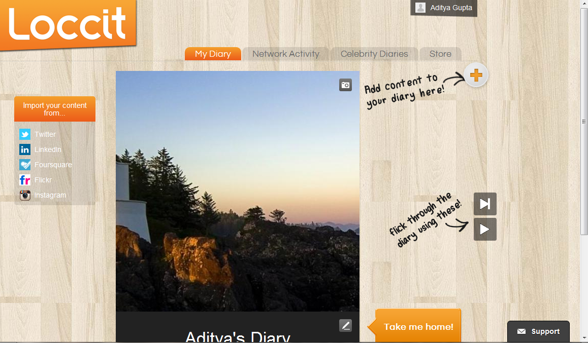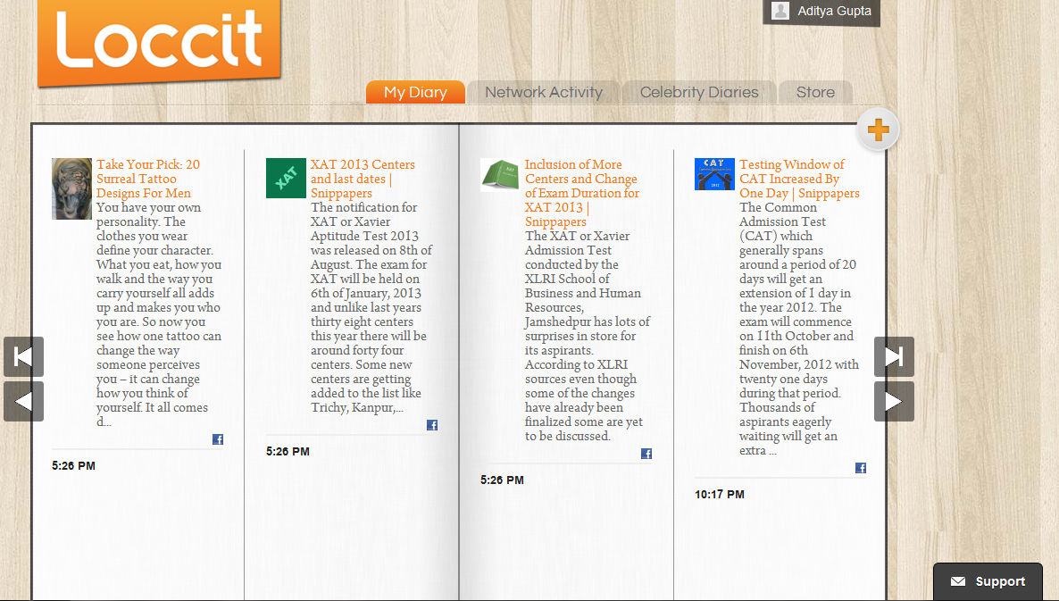 You get two options to flick through the pages in your diary, one helps you to have a look at the contents that you added in the Loccit diary and the other helps you to have a look at all the activities that took place in your social media account. It can be either facebook or twitter, once there is an update in your account it will be automatically added to the Loccit diary.