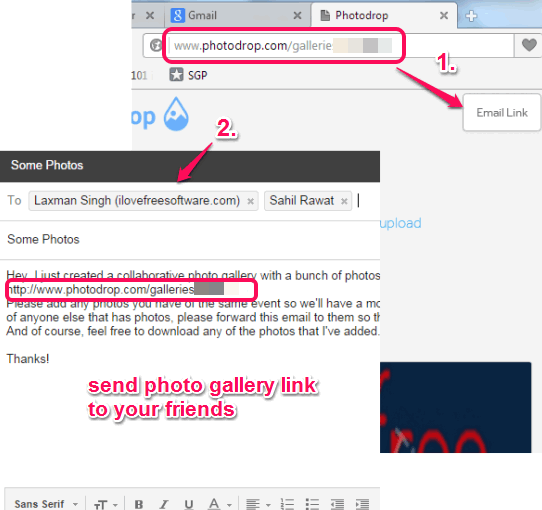 Step 4: After uploading all the photos, your photo gallery link will be created. Tap on Email Link button available at the top right side. It will direct you to a new page for composing a new mail with your Google account. If you are not logged into your account, then you need to login first. After this, in compose mail box, it will enter your photo gallery link with default message and subject. You can customize the message and send email to required people.