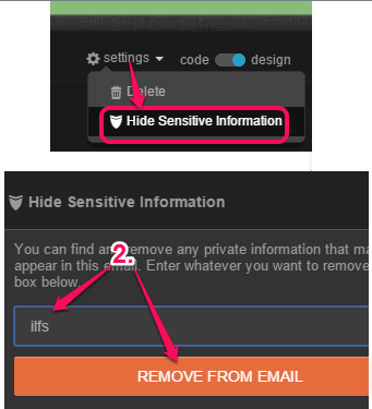 Step 7: Just before source view and design view option, you can see ‘Settings’ button. Using this button, you can hide sensitive text from email. You need to enter the exact keywords (separated by comma) and that particular text will hide behind ‘xxxxx’ from the email. So, people won’t be able to see the text hidden by you.