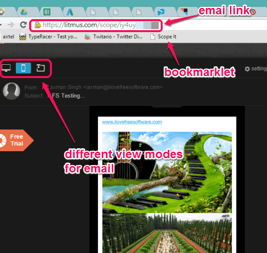Litmus Scope is a free bookmarklet to share your Gmail emails by generating a unique link for any particular email. Shared emails are known as ‘scoped emails’. You can share email link with anyone to let he/she view that email in a beautiful web-based version. You and other people can also see how the email will look on the desktop and in mobile. Not only this, you can also view only text of that email.