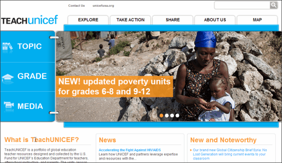 TeachUNICEF provides the educational material for teachers, that can be used to educate children, and create awareness about various critical global problems, like: poverty, child labor, armed conflict, water crisis, health, etc. This site gives different educational resources, such as, lesson plans, articles, audios, videos, etc. that explain the consequences, and other steps taken to control the crisis.
