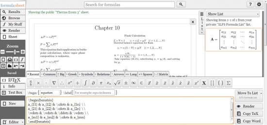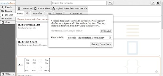 formulasheet.com is a free web application that lets you search, create, store, and share formulas online. It’s a handy and useful app designed to help you manage all your formulas from a single place. Whether you are a student, a professor, an aspiring engineer, or anyone dealing with formulas in day to day life, formulasheet.com is the right place for you. It lets you create formulas from scratch using a powerful equation editor, upload formulas as LaTex file, search wikipedia or FormulaSheet for formulas, copy formulas to LaTex or Microsoft Word 2007 or higher, store all your formulas safely on a cloud storage, organize them in lists, combine them with text or images to be rendered as pdf documents, text files, or images, and share them with people all over the world.