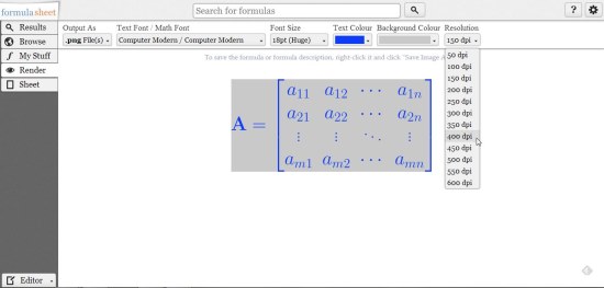 - Render: The “Render” section provide some formatting options and allows you to render formulas as text, pdf, or image files.