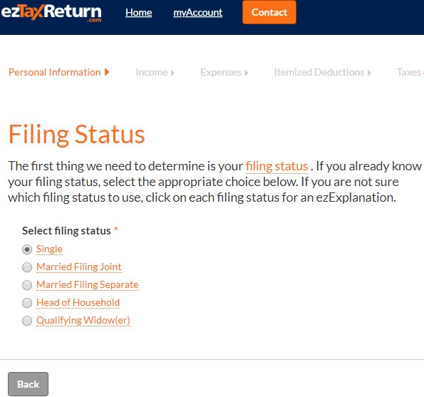 Click on the start now button to start doing your taxes online. You will be asked to create an account on the website to start. Enter a username and password to create an account. Then set some security questions for times when you forget your password. Once done you move on to the filing status screen.