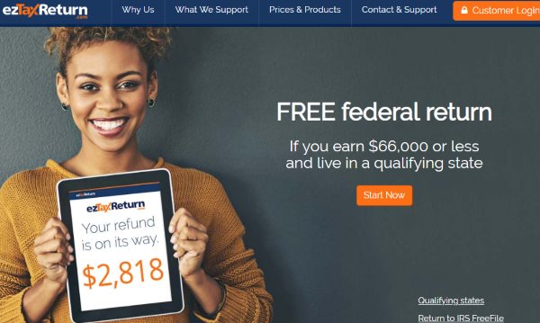 Another free filing tax program for this year is ezTaxReturn which is also a part of the IRS free file alliance. Using this website you can file free tax return. If you qualify for free federal return filing then you can also file the state return for free. Like all the other tax websites that we have covered so far like 1040.com, H&R Block, TaxAct, and TurboTax, this website also has some qualifying criteria for the free return. If you qualify the conditions given on the website, then you are eligible to file both your federal as well as state return for free.