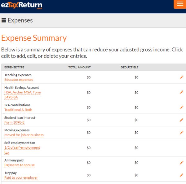 Click continue to move on to expenses and deductions section. Firstly, you will be asked if you had any teaching expenses, then you need to answer some questions about your health savings account. Then answer questions about IRA contributions, alimony paid, student loan interest, moving expenses, business expenses, etc. At the end of this section you will be shown a expenses summary.