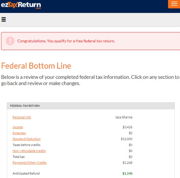 The next screen will tell you if you qualify for the free return or not. The top of the screen will show in red color that you have qualified for a free return. This can be seen in the screenshot above.