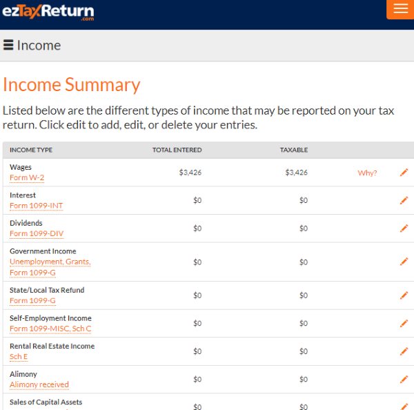 In the other income section you will come across categories like tips, scholarship, interest income, dividend income, capital gains or losses, unemployment compensation, self employment income, rental real estate income, retirement income, etc. Go through each of these sections and answer as applicable to you. At the end of this section you will be shown a income summary.