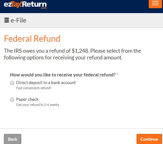 Here you will be asked about how do you want your refund back. You can choose between direct deposit in the bank account or getting a paper check. After this you are ready to efile your tax return. If you have filed a previous year return, then you will be asked some questions about the previous return. Otherwise, you can enter a 5 digit pin number which will be used as your signature and fill in some other information. Now you are ready to efile your federal, as well as state tax return for free.