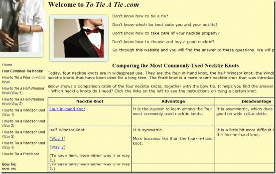 To Tie A Tie is a website to learn to tie a tie. On the homepage, it offers you a table that covers the common tie knots, like: Four-in-hand knot, Half-Windsor knot, Windsor knot, and more, along with their advantages, disadvantages, and suitable outfits/occasions.
