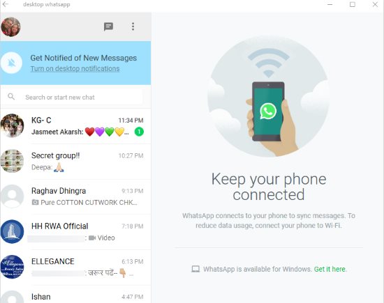 When you start the app you will see a QR code on your screen. You have to open up WhatsApp on your mobile device and go to the option WhatsApp web and scan this code that you see on your screen. As soon as you scan the code, the app will sign in with your ID and all your recent conversations on WhatsApp will become available in this app. This can be seen in the screenshot below.