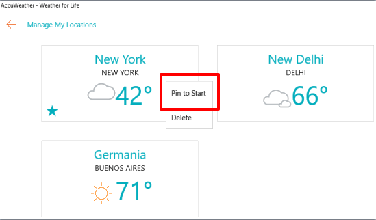 To pin tiles of other cities, go back to Weather app, and then select another city. After that, again pin the app, and now weather app will be pinned in Start menu for that city as well.