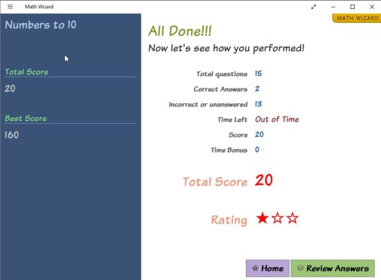 Math Wizard is a free Windows 10 math app for kids which comes with various exercises to learn mental math. Mental math means the ability where the child can calculate things in his/her mind itself without the need of a paper and pen. The app has exercises focused on math skills for kids. The app teaches kids various concepts of maths by focusing on thinking and performing mental math. The exercises are pretty simple and involve everyday things like money counting, clock reading, number visualization, etc.