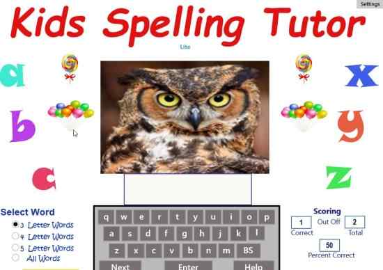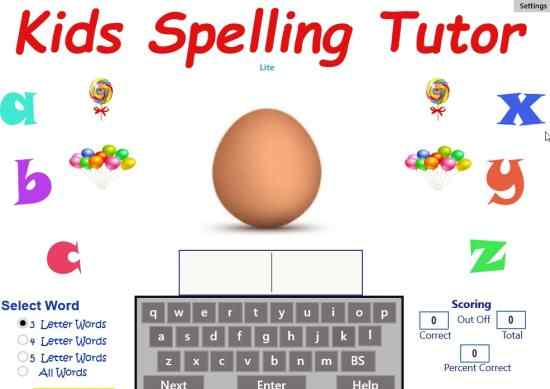 Windows 10 Spelling Tutor App for Kids to Learn 3, 4, 5 Lettered Words