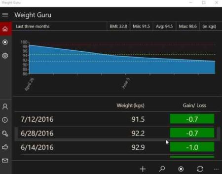 You can see a graph as well as a table representing your weight change. Loss in weight is represented by green color whereas, gain in weight is represented in red color. At the top of the window you can see your BMI, average, maximum, and minimum weight for the last three months.