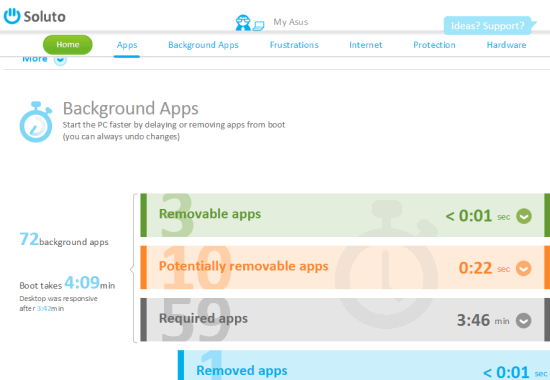 Soluto is an all in one solution to improve boot performance and take action for startup programs. It first analysis all the apps that start with Windows boot. After this, it shows the list of those apps that you can either remove from startup list or can delay them to launch later. It doesn’t let you set delay time for startup programs, but intelligently launch the delayed programs when your PC is idle. It also provides recommendation whether you should delay a particular program or not.