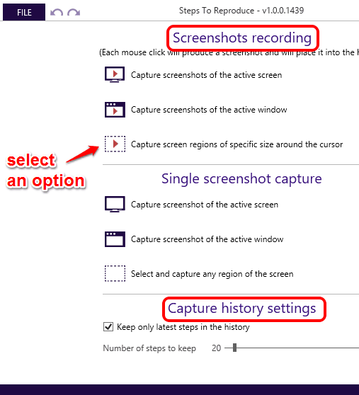 Download this software and install it. When you will launch it, it will show you Options window. Using that window, you can set the number of screenshots to keep and choose what you want to capture. For example, if you have to capture series of screenshots of a specific size, use the third option available in screenshots recording menu.