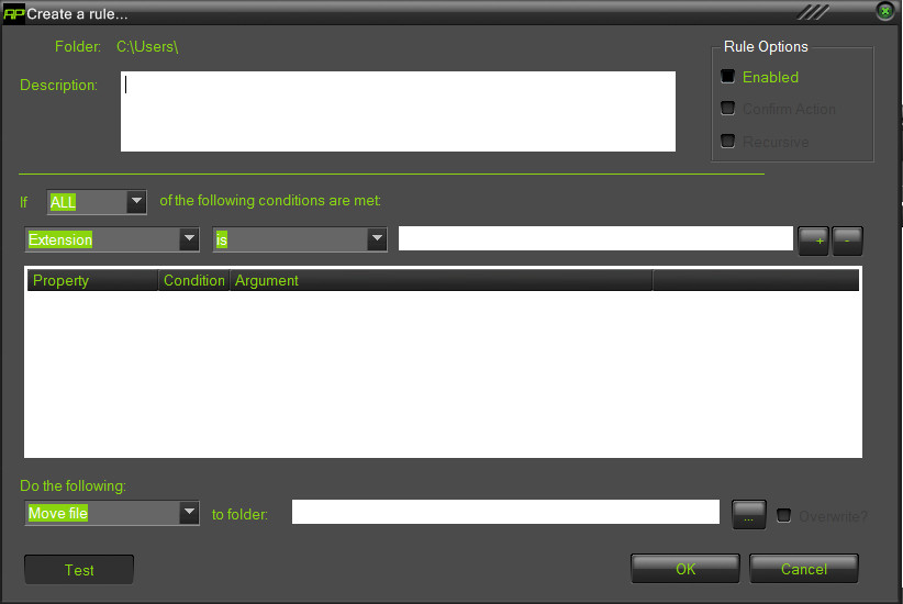 This is where you can create which scenarios will trigger which file manipulation, but first you will need to select folders which are being monitored for this rule and another folder where whichever file operation that we’ve chosen will manipulate the file to. The source folder has to be selected before entering the Create new rule window, and the outgoing folder is set near the end of this very same window, under the Do the following section. In this area you can also select what you want to do with the file, move, delete or copy.