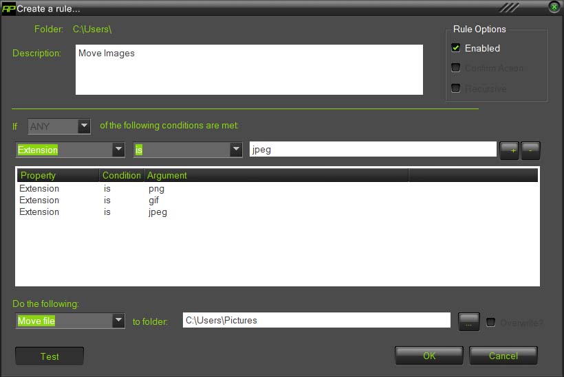 This is how a rule looks like, a rule which will transfer all .png, .gif and .jpeg images from Location A, to Location B. This rule has an IF conditional clause which states that if any files which have the selected extensions appear in the selected folders, then the program will automatically transfer them to Location B.