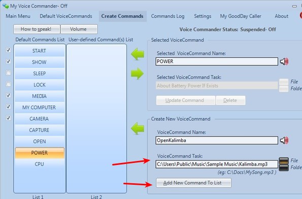 Those who are interested in creating their own commands have to open up the Create Commands tab. You can mostly open up files and folders. In the bottom right corner type in the command name, this is what you’ll have to yell, and then down below navigate to files or folder that you’d like to run. When you’re done click the Add New Command To List button. To test and see if the command works, shout it in the mic and see what happens. Open up the Settings tab for various fine tunning of voice command behavior.