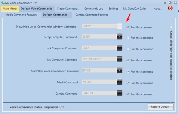 Those who are only after the default voice commands which are available, that we mentioned a few lines back, you can find out what these commands are by clicking on the Default VoiceCommands tab. On the left you can find command descriptions while in the middle the actual voice command that you have to yell can be seen and edited if you want. If you for example want to put computer to sleep, you need to say SLEEP into the microphone.