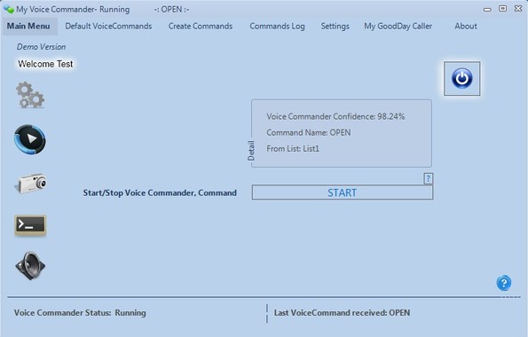 To use My Voice Commander you’ll of course have to have a microphone setup. First thing that you’re gonna see after running this voice control software is the Main Menu where you’ll be able to check up on its status. Options for configuring voice commands can be accessed by switching between tabs at the top of the interface, see image down below.