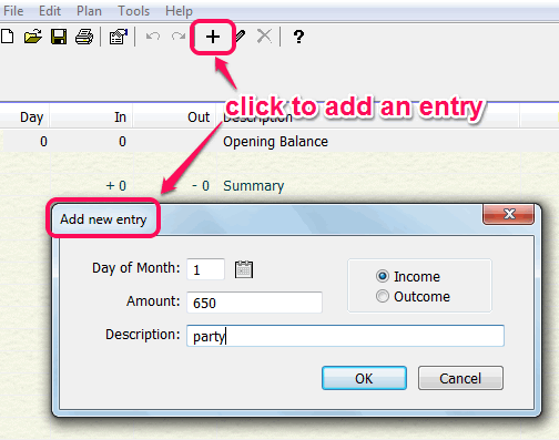 To add an entry, you simply need to double-click on its interface. You can also use context menu or ‘+‘ button to add an entry. It will open a small window where you can add day number, amount for the day, and type of amount (income or outcome). Description related to that entry can also be added in available box.