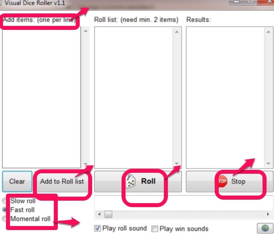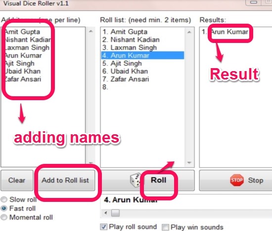 To use this software, you need to first specify the list of items that will go on your dice. These could be words, numbers, or anything else. For that, you need to click on “Add items” button. Then click on “Add to Roll list” button and next click on “Roll” button. After that it rolls and shows you the result. You can also choose your desired roll speed: slow, fast, or momental.