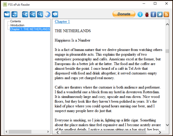 Here is a free and easy to use ePub reader software, named FSS ePub Reader. It’s a very simple software that kids can use to read stories available in Electronic Publication (ePub) format. It is also a good ePub reader for beginners, who don’t want to get stuck with complicated options. This ePub reader comes with Day and Night modes and also provides zoom in and zoom out options.