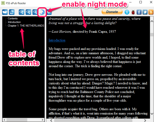 To read an eBook, drag n drop that particular book from the source location to its interface. After this, table of contents of that ePub file will be visible on the left side on its interface. Start reading your eBook and use the table of contents to navigate to a particular chapter. You can also use zoom in and zoom out buttons and switch to Night mode to comfortably read the eBook.