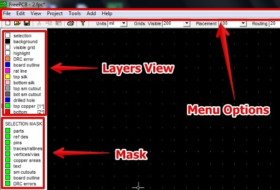 FreePCB is simple to use. When you start FreePCB, you will be prompted to select the properties of board like trace width, number of copper layers, and option to auto save. After that you can view the user interface.