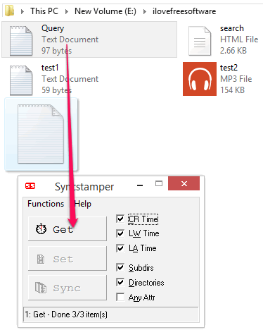 Syncstamper is a free software to copy timestamps from one file to another. Using this software, you can easily copy timestamps like Creation date, last modified date, last access date, etc., from one file to another file. And not only a single file, you can also copy timestamps to a group of files by a simple drag and drop operation. And if anything goes wrong, then you can always undo the operation.