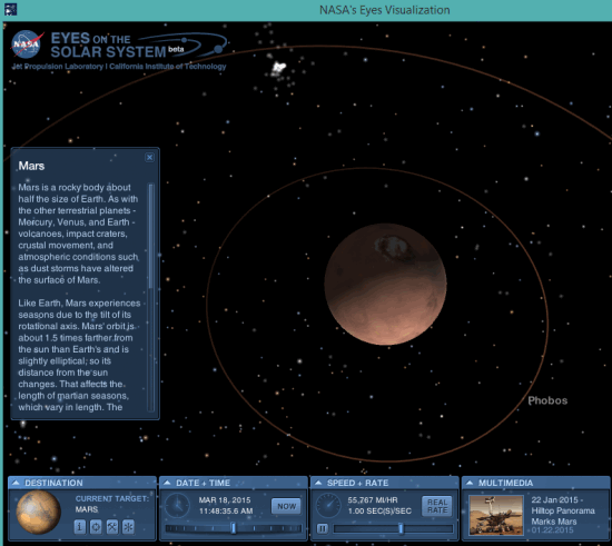 NASA’s Eyes (official software by NASA) is surely the best software in this list. It will help a lot to improve your knowledge about planets, moons of planets, various missions related to planets, and outer space. So it is not only limited to provide the vast information about solar system. You can get knowledge about Earth and planets circling around other stars, as well as move thousands of miles away from home planet right from your desktop screen. 3D view provided by this software makes it more interesting to learn about solar system.