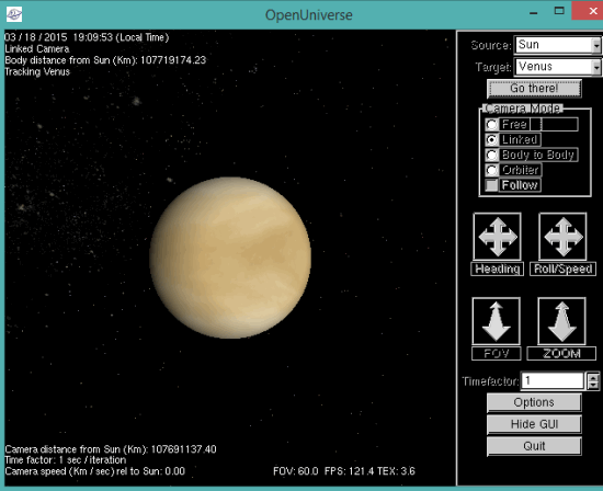 You can either set source and target planet to automatically jump to that part or can enable free mode to manually travel in solar system. You can also check how a particular planet looks if seen from sun. Apart from this, total body distance of a planet from Sun is also visible.