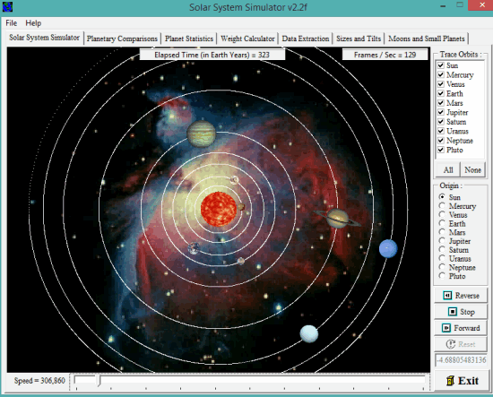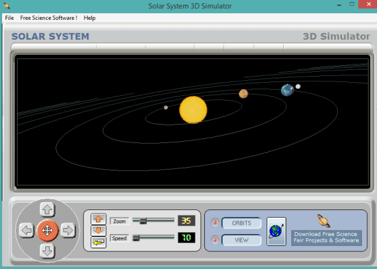 This is also a good software to start solar system simulation in 3D mode. Its interface provides the controls to set zoom level, rotation speed, and position to display planets. Apart from this, you can also hide/show orbits of planets. There are no additional features in this software, but yes, you can view detailed information of any planet.