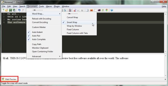 The program comes with a tabbed interface with customizable toolbars. And besides providing the basic text editing features like line numbering, auto complete, and syntax highlighting, EverEdit offers so many useful functions which makes it a powerful text editor software. Some of them include full unicode support, template support for faster coding, use of regular expressions, internal browser preview of the document, moving text through drag and drop, and lot more. Let’s have a look on its various key features.