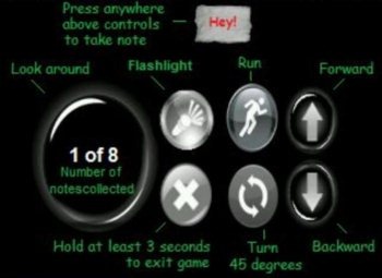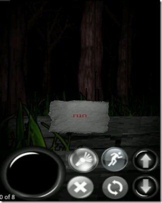 The controls are located below the screen. The big round bubble is to move your character. Tap the light symbol to on/off torchlight. Tap on the human symbol to run for your life. Upward arrow for moving forward and downward area for moving backwards. The bent circular arrows button is for turning your character 45 degrees. The cross symbol is for quitting the game; press it for three seconds to quit.