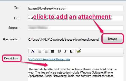 - It can send emails including Cc from desktop and also lets you send attachments. But only a single attachment is possible with an email.