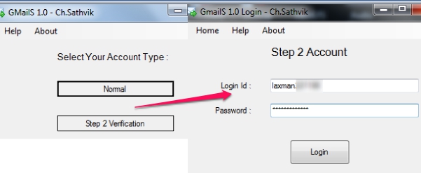 To start using GMailS, install it, and open its main interface using start menu or desktop icon. Now, select an account type: Normal account or Step 2 Verification. Although, it doesn’t matter a lot as you can login easily with Normal account, even if two step verification is enabled in your Gmail account. Thus this option is not beneficial and its purpose is also not clear.