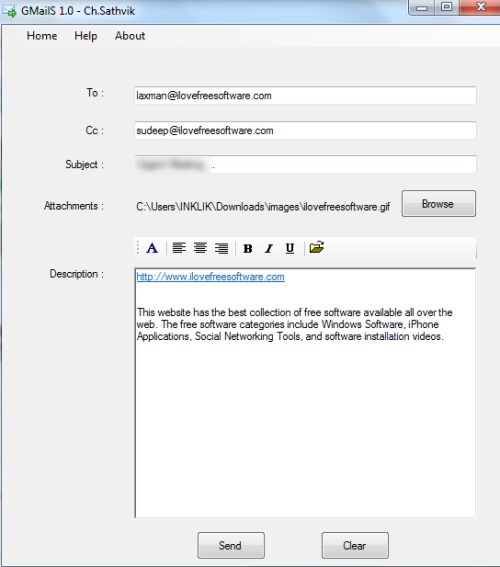 GMailS is a free desktop application that is used to send emails and attachments right from the desktop by login with your Gmail account. Thus once after login to this application with Gmail, you can send text emails, plus able to add an attachment (image or small zip file) to send to recipient. You can even add Cc (carbon copy) email and can send message without opening any web browser. It’s not a Gmail desktop client, but a lightweight application that allows to send emails with Gmail account.
