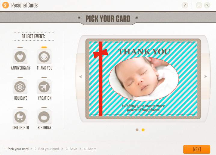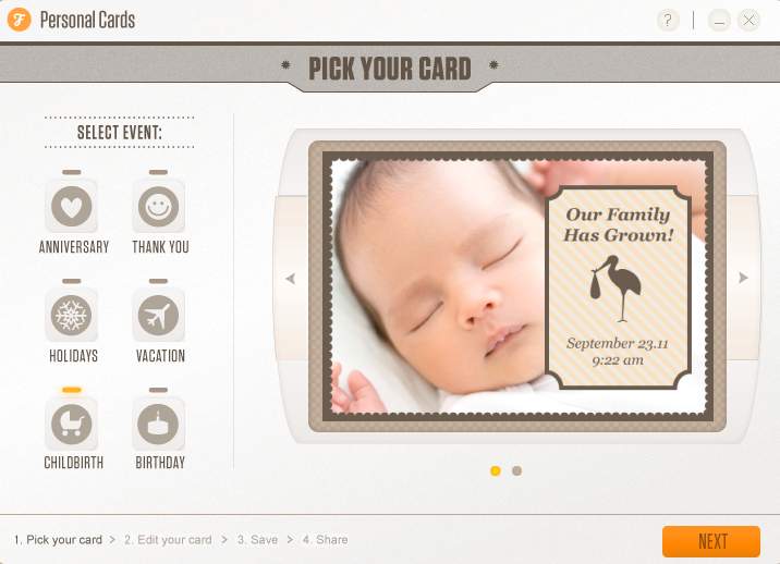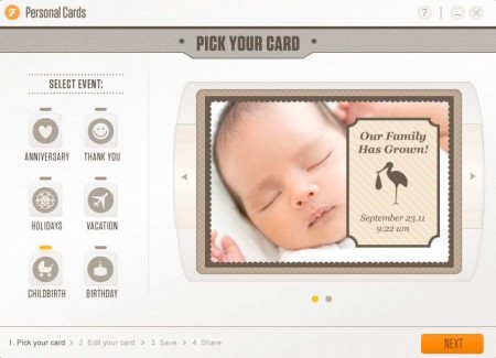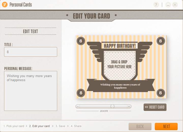 Format in which the card will be saved is JPEG, it cannot be changed, if you were wondering that. By clicking on Next once more you will be presented with options to share your greeting cards through email, twitter and Facebook. And that’s all, the greeting card is finished. Personal Cards is great for everyone who’s interested in creating cards, but is not interested in dealing with more advanced graphics tools to create them, it’ll save you time, but you’ll still create amazing cards, a win-win situation indeed.