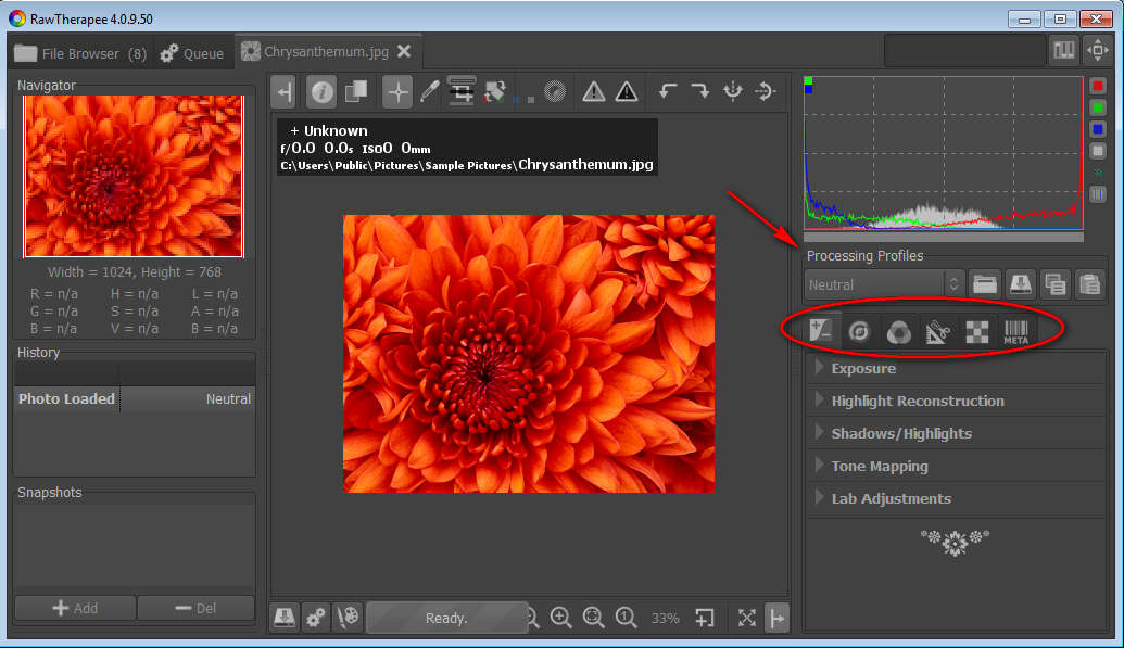The two most important tools of RawTherapee are marked with red on the image above. What’s marked are 6 different image editing tool categories where you will be able to find practically everything that you need for successfull batch image editing. The categories that we are here mentioning are: