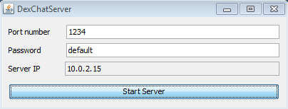 The first step to use DexChat would be that you actually have computers connected either directly with the ethernet cable, or through the router in a local network. Then you need to start the DexChat sever, which can be seen on the image above. Enter the port number, then access password, and lastly the server IP.