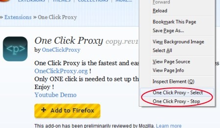 OneClickProxy is a Mozilla Firefox extension that lets you to easily change your IP address and browse anonymously with just a single click of mouse. There is nothing complicated, even a novice user can use it very easily. You will find a list of available proxies with the help of this extension. You just need to select the desired proxy from the available list and start using it.The available proxies are tested also, so most of the proxies work.