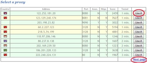 - Now, simply click on the One Click Proxy- Select option and it will provide you a list of proxies (see the below screenshot) in One Click Proxy tab on your Firefox browser. You can click on available Next page option to see more proxies. For using a proxy, just select the desired proxy by clicking on Use it! button and start browsing.