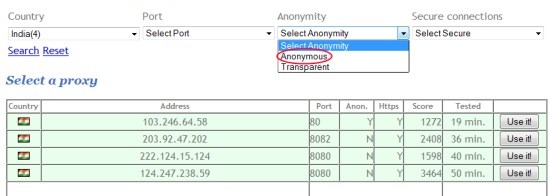 - Select the Anonymity (anonymous or transparent), kind of secure connection (http (secure) or simple http) from the drop down menu. Now you can see the filtered list of available proxies. Select the desired one by clicking on the same Use it! button and browse in a secure and faster way.