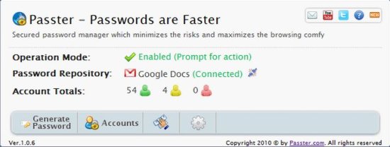 Passter extension for Chrome is easy to install and simple to use. Passter icon is present on address bar when you click on that a pop-up menu is displayed with its features and you can easily customize the passter according to your needs. Passter will generates strong passwords, manages your accounts and restores and backups your data and much more.