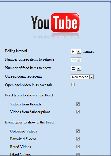 To go to the options of the YouTube feed extension you need to click on the settings option of your chrome browser and a new page will appear. In this page you need to click on the extensions menu and all the extensions will appear. Here you can access the YouTube Feed option and make appropriate changes. You can also go to the YouTube feed options panel by right clicking on the extension and then click on option. In the options page you can select which type of notification you want to see and which you don’t want. You can decide whether you want to see a new video uploaded by a friend or any other subscribed video. The options page also helps you make changes in the polling intervals and select whether you want to open the video in the same tab or new tab.