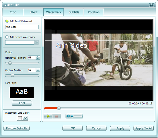 Visual effects and other video enhancements can be done by clicking the Edit button. This opens a new window with the appropriate editing tools. To crop a video, change the position of the crop window. You can also choose to keep the videos aspect ratio by checking the Keep Aspect ratio checkbox. Visual effects like brightness, saturation and contrast can be manipulated by moving the respective sliders. You can watermark the video with either text or an image. Add the appropriate text or select the appropriate image, set its position and click OK. The Subtitle tab can be used to add video subtitles in any position and using any type of font or styling. The video can be rotated up to 270 degrees. All changes to the video are viewed in real time and can be applied to one video by clicking the Apply or on all videos by clicking Apply All.