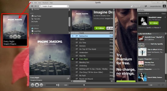 Winfy is a free mini player for Spotify desktop client (Windows) that lets you play and listen to your favorite songs on Spotify. It’s probably the simplest and minimalistic player for Spotify desktop client, capable of playing or pausing music, or navigating to the next or previous song in the list. Winfy comes with a small yet intuitive interface that displays the current track being played on Spotify desktop client, along with the artist name and album cover.